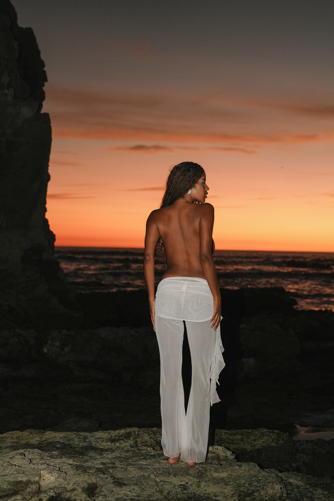 Low waisted . sheer pants designed to flow effortlessly with the body. Featuring a lightweight, semi-transparent fabric and a relaxed silhouette, this piece creates an elongated and fluid look. Perfect for resort wear, beach styling, or layered over swimwear.