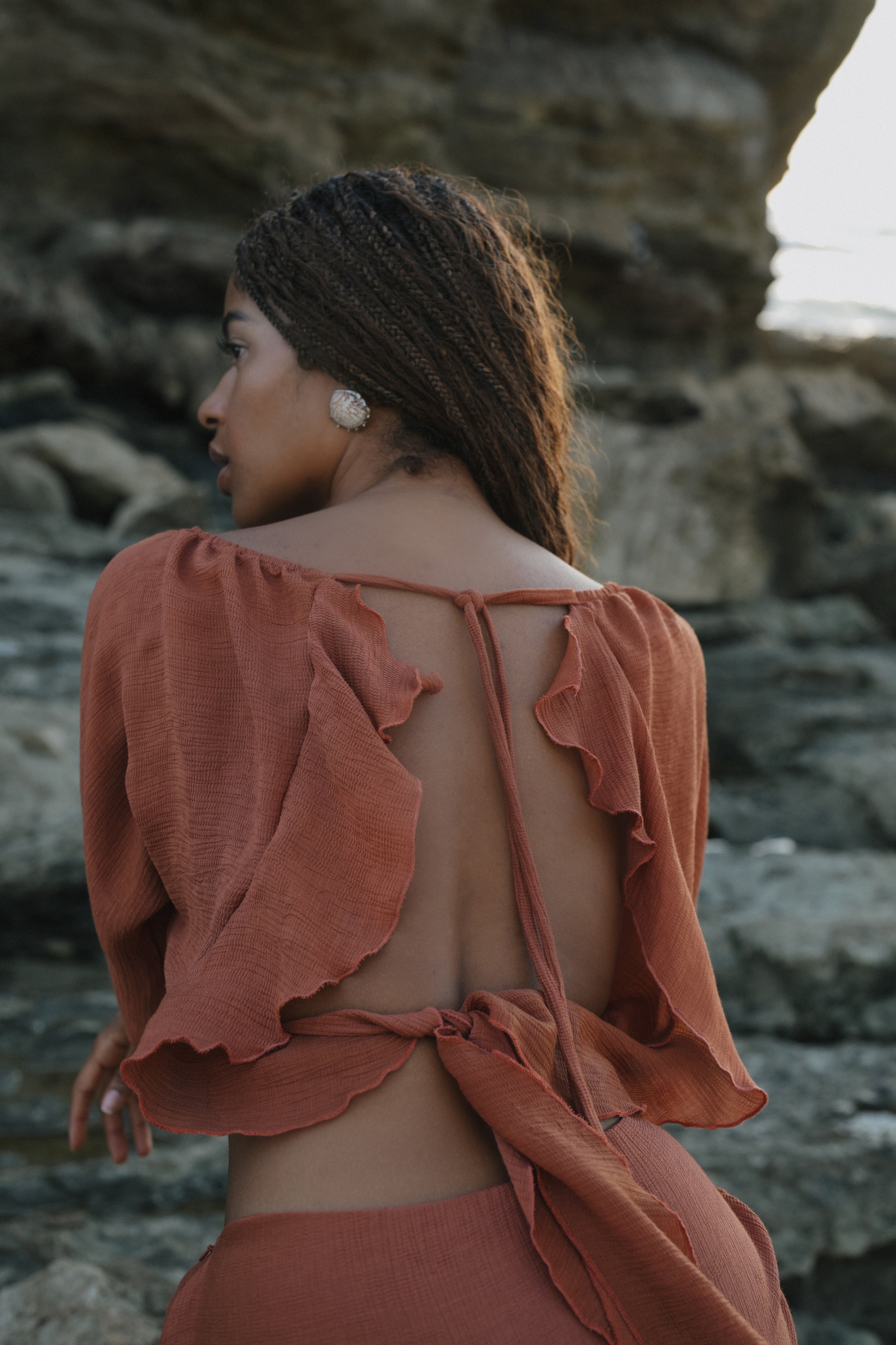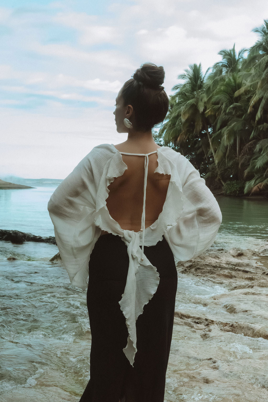 Lightweight cropped top with wide flowing sleeves and an open back with adjustable tie detail. Designed in sheer, airy fabric that creates soft movement and an effortless silhouette. A versatile statement piece, perfect for resort wear, beach looks, and elevated tropical styling.
